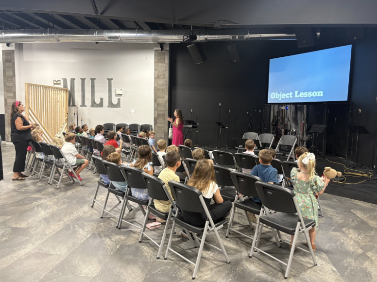 • Children begin in the main worship service and are dismissed about 20 minutes in to The Mill room upstairs